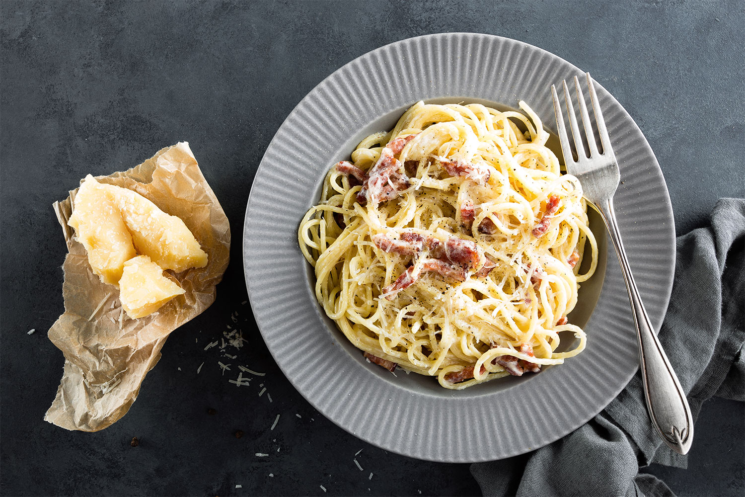 Sos carbonara pochodzi z regionu Rzymu i został opracowany przez alianckich żołnierzy w czasie II wojny światowej. Nie mając zbyt szerokiego wyboru połączyli oni makaron z dostępnymi produktami wchodzącymi w skład racji żywnościowych. Sos do spaghetti carbonara składa się z boczku (najlepiej pancetty), żółtek, parmezanu, sera pecorino, oliwy, soli i świeżo mielonego pieprzu. Należy pamiętać, że – wbrew większości polskich przepisów na carbonarę – do sosu nie dodaje się śmietanki! Z podanego przepisu wyjdą 2 porcje pysznego makaronu.