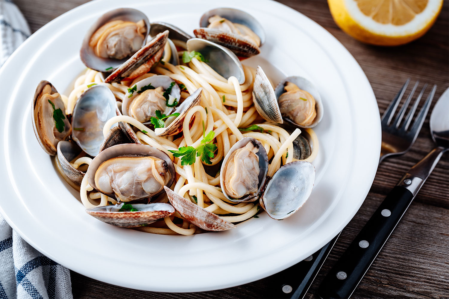 Ekskluzywny klasyk kuchni włoskiej, czyli spaghetti z małżami. Najbardziej popularna wersja to bianco, w której składnikami są tylko owoce morza. Natomiast na południu Włoch często spotyka się wersję rosso, wzbogaconą o posiekane pomidory. Z podanych składników otrzymamy 4 porcje.