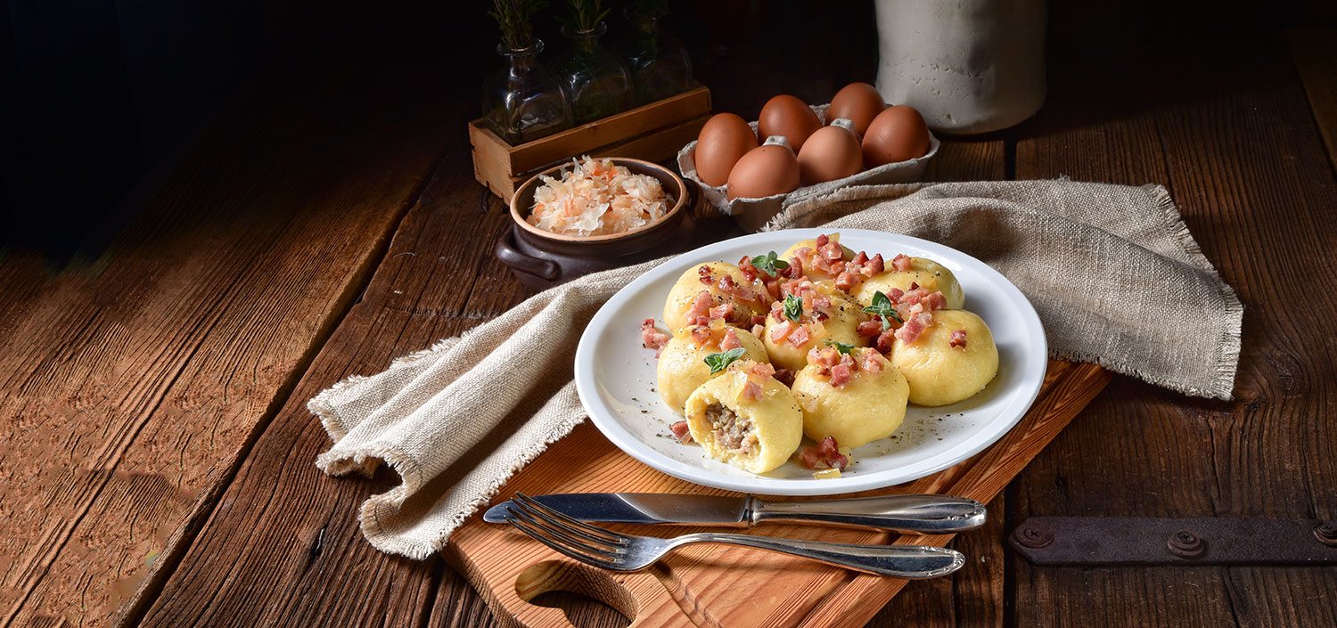 Duże kluski owalnych kształtów, na bazie ziemniaków z dodatkiem mąki to jedne z tradycyjnych polskich potraw. Spotykane często pod nazwą pyzy, knedle czy kartacze. Pierwsza inspiracja dania mącznego z mięsem to bezglutenowe, pełne smaku pyzy ze skwarkami.