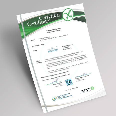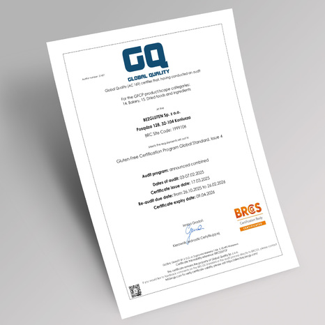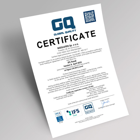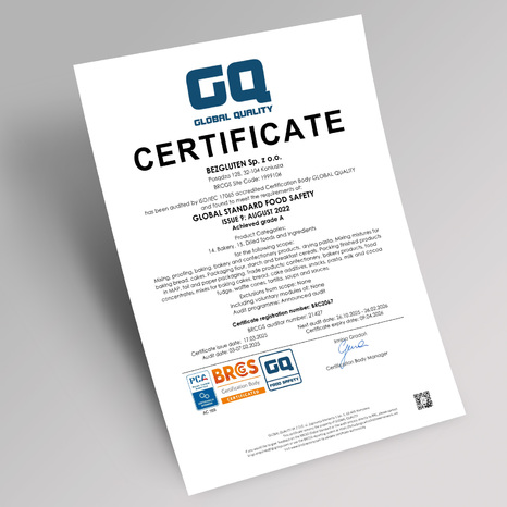 Szczególną uwagę przywiązujemy do bezpiecznego procesu produkcji artykułów bezglutenowych i niskobiałkowych. Współpracujemy tylko ze sprawdzonymi firmami. Przeprowadzamy skrupulatne analizy jakości i składu dostarczanych nam surowców, aby mieć pewność, że nie zawierają zanieczyszczeń. Z tego względu wprowadziliśmy międzynarodowy standard kontroli jakości żywności i bezpieczeństwa Global Quality BRC Food v.9 oraz IFS v.8. z programem Gluten Free - który otrzymaliśmy jako pierwsi w Polsce. Właśnie te działania są gwarantem nie tylko naszego sukcesu, ale również sukcesu naszych klientów, którzy z powodzeniem mogą te produkty włączać do swoich codziennych jadłospisów. Jesteśmy cenieni nie tylko za profesjonalizm, ale również za troskę o konsumentów i przyjazny design.