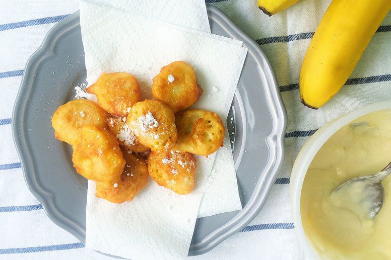 Wszystkie składniki ciasta mieszamy ze sobą, a następnie dodajemy ananasy i ponownie mieszamy tak, aby każdy kawałek owocu był dokładnie pokryty ciastem. Łyżką nakładamy porcje masy i kładziemy je na rozgrzanym oleju. Smażymy z obu stron do uzyskania złotego koloru, a następnie przekładamy na ręcznik papierowy, żeby pozbyć się nadmiaru tłuszczu. Przekładamy na talerze, posypujemy cukrem pudrem i od razu podajemy na stół.