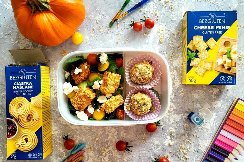 Bezglutenowa sałatka z tofu w panierce z ciastek serowych Cheese minis