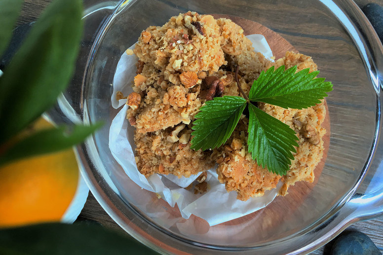 Masło topimy z cukrem w rondelku, a następnie przekładamy do miski i łączymy z mąką, płatkami, bakaliami oraz wydrążoną laską wanilii. Masę dokładnie wyrabiamy tak, aby każdy składnik był dokładnie pokryty tłuszczem. Kiedy będzie gotowa, wykładamy nią silikonową, prostokątną formę do pieczenia i ugniatamy, wygładzając nierówności. Wsadzamy na ok. 25-30 minut do dobrze nagrzanego piekarnika, a następnie czekamy, aż wystygnie. Ciasto wyjmujemy z formy dopiero po całkowitym wystudzeniu (warto zrobić je poprzedniego dnia). Zimne, kroimy w prostokąty lub odrywamy kawałki rękami.