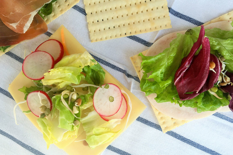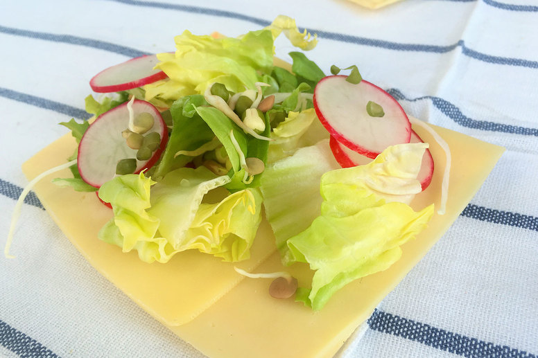 - Chleb chrupki marki BEZLGUTEN, żółty ser, kiełki np. brokuła, sałata, rzodkiewka