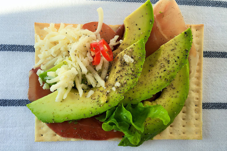 - Chleb chrupki marki BEZLGUTEN, masło, liście szpinaku baby, szynka parmeńska