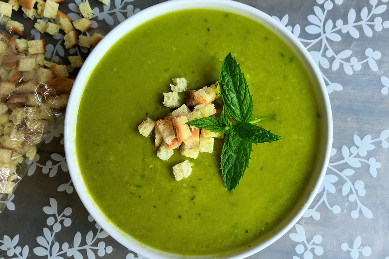 Cebulę i pora kroimy w talarki, a następnie podsmażamy ok. 10 minut na patelni z masłem. W tym czasie wrzucamy groszek do wrzątku i gotujemy na średnim ogniu. Gotowe warzywa wrzucamy do groszku, całość gotujemy kolejne 10 minut, dodajemy miętę, a następnie całość blendujemy na gładką masę. W razie potrzeby, jeśli krem jest za gęsty, dodajemy wrzącej wody. Doprawiamy do smaku solą i pieprzem i przelewamy do talerzy. Posypujemy grzankami i podajemy na stół!