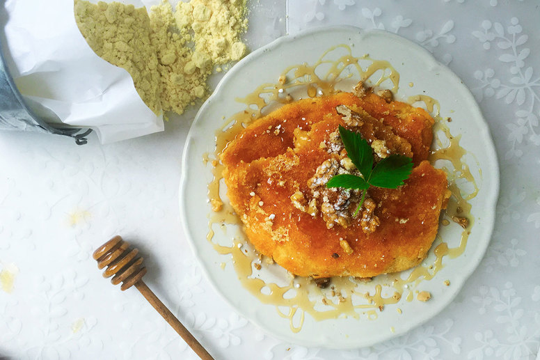 Białka jajek ubijamy mikserem na puszystą masę. Dodajemy resztę składników, a następnie całość dokładnie mieszamy łyżką. Masę wylewamy na rozgrzaną patelnię z masłem, tworząc kształt omletu i smażymy na średnim ogniu (za wysoka temperatura nie jest wskazana) do uzyskania złotego koloru i ścięcia się wierzchniej warstwy. Omlet przewracamy na drugą stronę (możemy go pokroić na patelni, łatwiej nam będzie go odwrócić lub od razu usmażyć dwa, mniejsze omlety) i smażymy jeszcze 2-3 minuty a następnie przekładamy na talerz i polewamy miodem lub syropem klonowym, posypujemy orzechami lub innymi, ulubionymi dodatkami.
