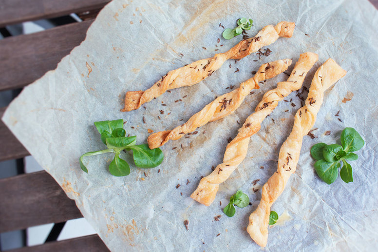 Ciasto francuskie wkładamy na 10 minut do zamrażarki. Każdy kawałek tniemy na wąskie paski (½ cm), a następnie zwijamy spiralnie. Całość posypujemy obficie kminkiem i wkładamy na 15 minut do piekarnika rozgrzanego do 200 stopni. Jemy na gorąco lub po wystudzeniu – na zimno. Smacznego!
