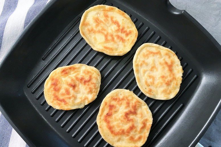 Wszystkie składniki ciasta mieszamy ze sobą, odczekujemy minutę i mieszamy ponownie. Łyżką nakładamy porcję ciasta na rozgrzaną patelnię z masłem, spłaszczamy i formujemy kształt kółka. Smażymy ok. 5 minut z każdej strony. W zależności od preferencji możemy podać mniej lub bardziej wysmażone.