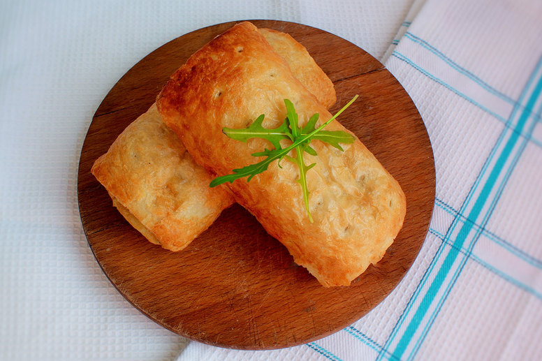 Ciasto francuskie wyjmujemy z zamrażarki. Każdą część docinamy na kształt prostokąta (o szerokości 10 cm) i rozwałkowujemy. Blaszkę do pieczenia wykładamy papierem i kładziemy na nim pierwszy prostokąt. Wykładamy nadzienie, przykrywamy drugim prostokątem, zlepiamy boki i dzielimy na 5 cm kawałki. Pieczemy w dobrze nagrzanym piekarniku (200 stopni) przez ok. 15 minut.