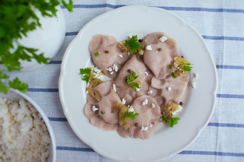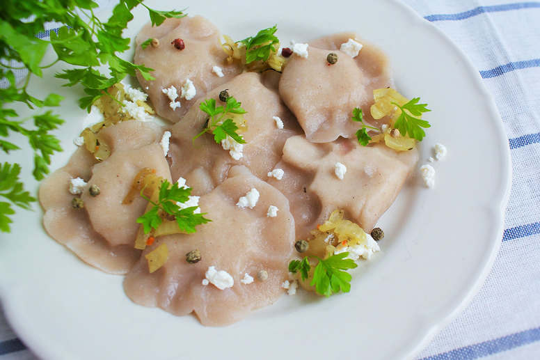 Przygotowujemy farsz. Cebulę kroimy w kosteczkę i podsmażamy na maśle do momentu, aż będzie szklista. Połowę cebuli wrzucamy do miski, dodajemy ugotowane i wyciśnięte przez praskę ziemniaki oraz twaróg, sól oraz pieprz. Całość ugniatamy widelcem i dokładnie mieszamy.