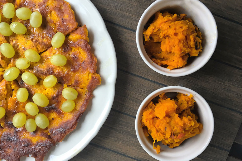 Mąkę, kaszę, dynię, mleko i jajko blendujemy na jednolitą masę. Na rozgrzaną patelnię wylewamy olej, a następnie przekładamy masę, spłaszczając ją i formując ją na kształt omletu. Smażymy z obu stron po ok. 8-10 minut do uzyskania złotego koloru.
