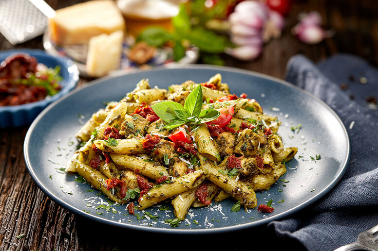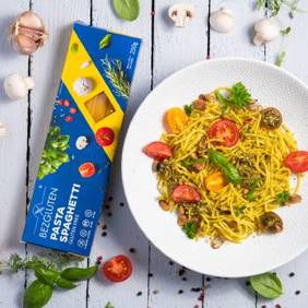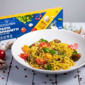 Makaron ugotować według przepisu na opakowaniu. Rozgrzać olej w rondlu, włożyć drobno pokrojony czosnek i chwilę podsmażyć. Następnie dodać zamrożony szpinak, przykryć pokrywką i dusić na małym ogniu aż szpinak się rozmrozi i będzie gorący. Na końcu doprawić do smaku solą, pieprzem i przyprawą warzywną, dodać 2 łyżki sera i zamieszać. Tak przygotowany szpinak podawać z gorącym makaronem. Na koniec posypać resztą sera.