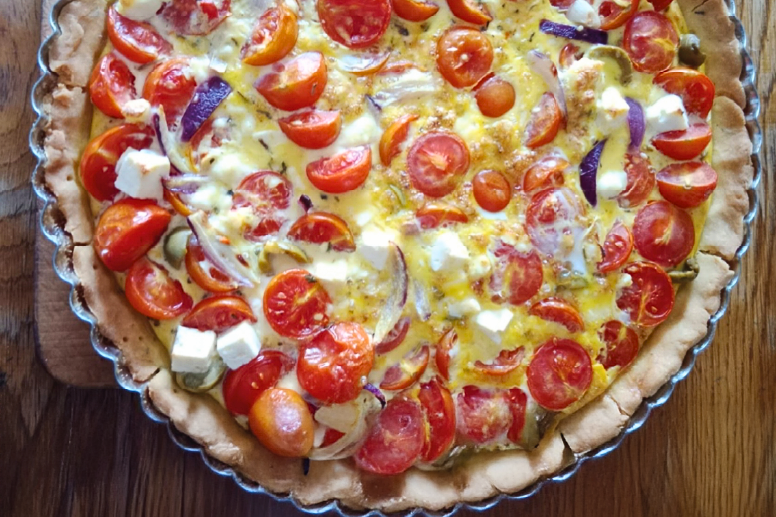 Wytrawna tarta z serem feta, szpinakiem i pomidorkami koktajlowymi